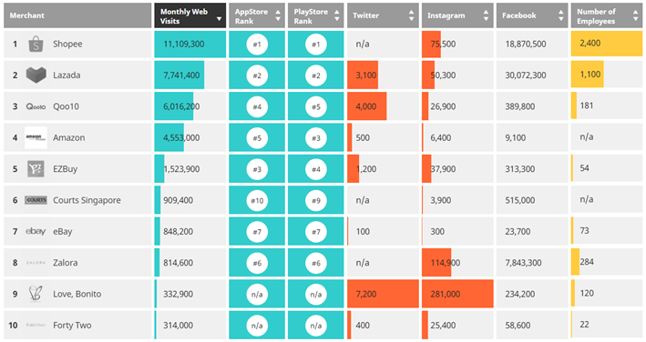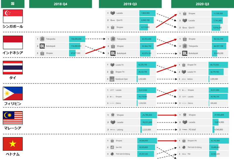 ゲーム好きの方であれば、GarenaのFree Fireという名前を聞いたことがあるかもしれません。Garenaは社名をSea Ltd.に変更の上、2017年にニューヨーク証券取引所(NYSE)に上場していますが、祖業のデジタル・エンタメ事業(DE事業)である「Garena」の他、デジタル決済事業の「AirPay」、そしてモバイル向けEC事業の「Shopee」の3つを主要事業として展開しています。 Shopeeは2015年にサービスを開始し、近年は東南アジア各国で目にする機会が増えました。例えば、2020年3Q時点のシンガポールのECランキングを見ると、Lazada、Qoo10、Amazonといった大手を抜いて1位となっています(図1、サイト訪問者ベース)。同様にアジア各国のECランキングを見ると、マレーシア、タイ、インドネシア、ベトナム、フィリピンで同様に1位となっており、この1年で多くの東南アジアの国でNo.1の座を獲得しています(図2)。全世界の流通総額(GMV)で103億USD以上、売り手は800万件、買い手(利用者数)は2億人以上で、そのうち45%程度はインドネシアにおける取引と言われています。図1 シンガポールのECランキング(サイト訪問者ベース)