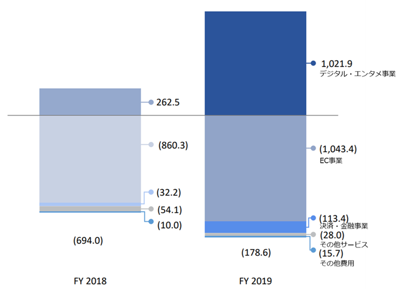 ただし、SeaのIR資料によると、FY2019の売上は$2,917 Mn、その内訳はDE事業が約60%、EC事業が32%となりますが(図3)、EBITDAを見るとDE事業の儲けのすべてがEC事業の赤字で帳消しとなっています(図4)。DE事業に続く事業の柱とすべくEC事業ではしばらく投資ステージが続いていましたが、各国で1位となった2020年を境に、Shopeeが今後どのように利益を上げていけるか見どころとなります。