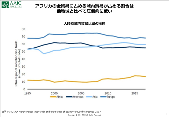 まず初めにアフリカの貿易面の課題とその要因について簡単に説明します。 アフリカ大陸は域内貿易が他大陸に比べて、圧倒的に少ないという問題を抱えています。その少ない域内貿易品も資源品目が最大となっており、工業製品等はアジアや欧州、米国などからの輸入に頼っている状況です。