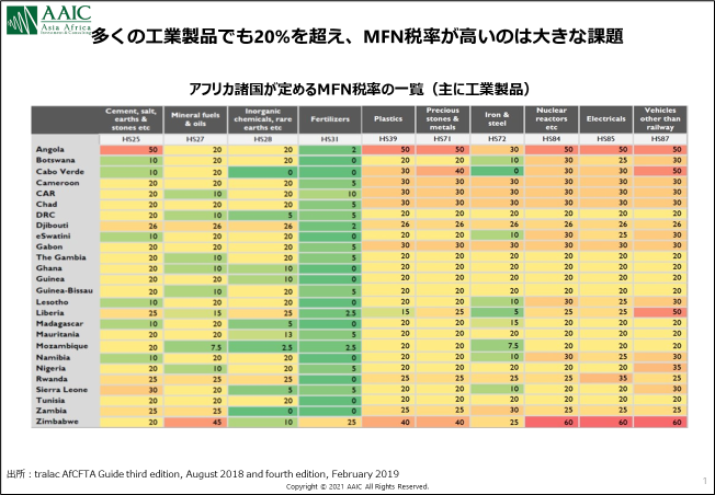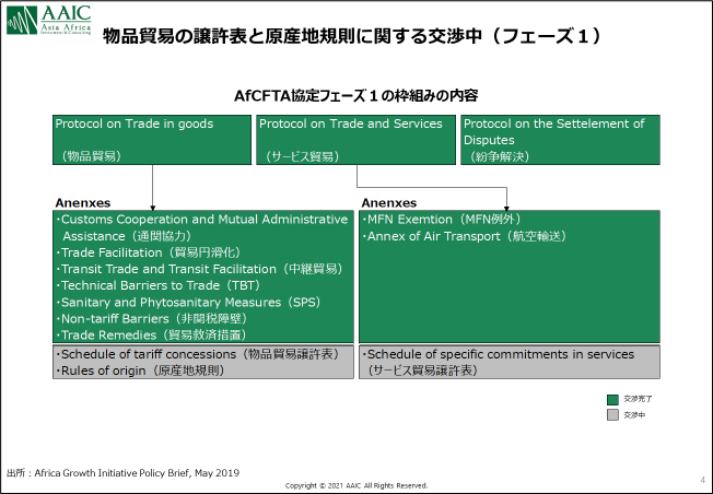 実はAfCFTA協定自体は枠組み協定に過ぎず、関税撤廃品目など詳細は依然交渉中です。協定はフェーズ1と2に分かれていますが、18年3月に合意されたのはフェーズ1です。これには物品貿易やサービス貿易が含まれます。そして、物品貿易の関税の詳細を決める譲許表の交渉を進めているのが現在のステータスです。物品貿易の譲許表の確定は延期を重ねて20年中を目指していましたが、21年1月現在引き続き交渉中となっております。21年中には確定するのではないかと言われていますが実現するかは不明です。