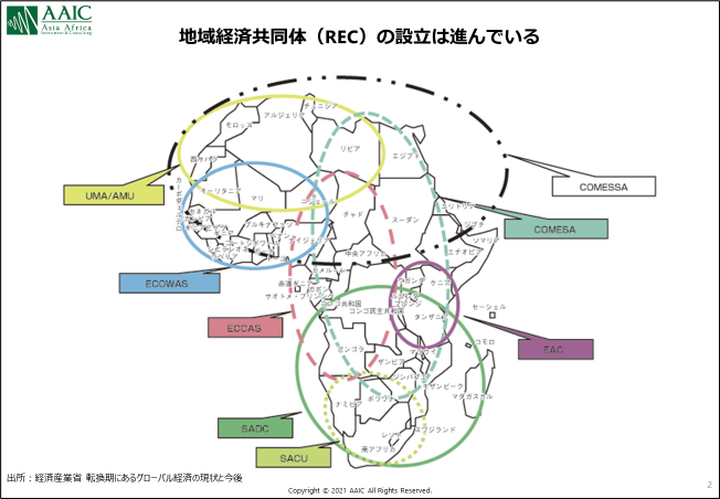ここまでの内容をベースに、冒頭の疑問に対する回答をまとめてみました。 Q「どれくらいの国が既に署名、批准しているの?」 A「20年12月末時点で、54か国が署名、35か国が批准」 Q「本当に加盟国間の関税が撤廃されたの?」「そもそも、本当に運用は始まったの?」 A「現時点では多くの批准国、RECで譲許表の確定に至らず、しばらく時間がかかりそう。21年内にまとまるかどうかは不明。譲許表確定後も関税撤廃までは5~10年の猶予があり、実際にAfCFTA税率での取引が実現するまではまだ時間がかかる」 20年12月31日に日経新聞が「アフリカ自由貿易圏、12億人市場始動 供給網に課題」という記事を発表するなど、本年1月1日に運用開始されたというニュースをいくつか見ました。しかし、実際のところは運用開始まではしばらく時間がかかりそう、というのが結論です。 実際にインパクトを与えるまで時間がかかりそうなAfCFTAですが、中長期的にはアフリカ域内貿易が関税なしで取引される可能性は高く、製造業については多くの商材でアフリカに製造拠点を持っているかどうかが勝負の分かれ目になってくると思います。 トップ画像出所:African Union(https://africa-eu-partnership.org/en/afcfta) 文章:AAIC 星野千秋【AAICからのお知らせ】