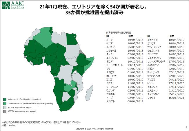 そのような状況の中、長年温められてきたアフリカ大陸全域の自由貿易圏構想が12年1月にエチオピアの首都アディスアベバで行われた第18回AU首脳会合で基本合意し、遂に本格的に動き始めました。 15年6月に正式交渉が開始され、18年3月21日にルワンダの首都キガリで開催されたAUの臨時首脳会合で、AfCFTA設立協定と2つの関連文書「AfCFTAの設立に関するキガリ宣言」、「ヒトの移動に関する議定書」の署名式が行われました。このAfCFTA協定には、式中に44カ国が署名し、18年4月にはルワンダとガーナが早くも批准しました。 それから約1年、19年4月に大きな節目を迎えました。ガンビア国民議会が批准を承認し、批准国が22か国に達したのです。AfCFTAは22カ国がアフリカ連合(AU)委員会に批准書を寄託した日から30日後に発効することになっていましたので、同年5月30日に遂に正式に発効されました。 20年12月現在、エリトリアを除く54か国が署名し、34か国が批准書を寄託済みです(21年1月にマラウイが批准し35か国に)。心配されていた大国ナイジェリアも20年7月に署名、12月に批准しています。