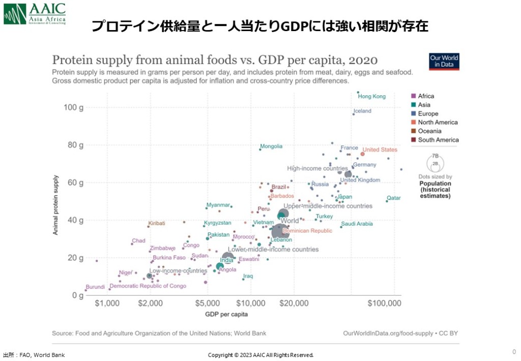 上記のチャートは、世界各国の一人当たりのタンパク質供給量を一人当たりのGDPに基づいてプロットしたものです。プロットの大きさは人口を示しています。ご覧の通り、強い相関関係があります。富裕な国ほどタンパク質の摂取量が多いのは当然のことですね。