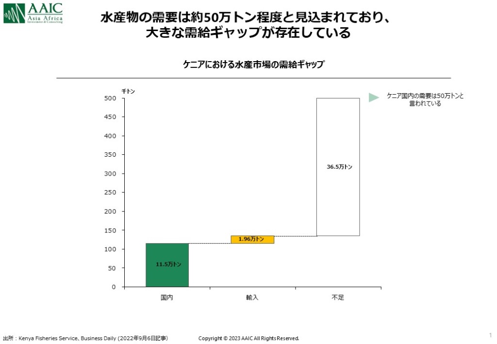 もともと、東アフリカではビクトリア湖を中心に漁獲がなされてきました。ケニアの水産業は国内漁獲高が11.5万トン、輸入が1.96万トンで計13.5万トンあります(参考までに、日本は2022年時点で385万トンの漁獲高があります、農林水産省のデータによる)。 報道によると、需要は約50万トン程度と見込まれており、大きな需給ギャップが存在しています。供給の87%が漁獲によるもので、そのうち83%が内水域での漁獲です。ビクトリア湖は内水域の70%を占めており、ケニアにおける水産業の中心地であることが分かります。 一方、輸入のうち80%は中国からのものであり、その大部分がティラピアです。