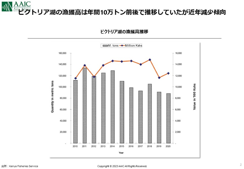 実は、ビクトリア湖の漁獲高は減少傾向にあります。かつては10万トン以上で推移していましたが、近年は8~9万トン程度。その原因は湖水の汚染と言われています。サステナブルな水産業の実現のために、ケニア政府はブルーエコノミーの開発を政策に掲げて、法整備等を進めています。