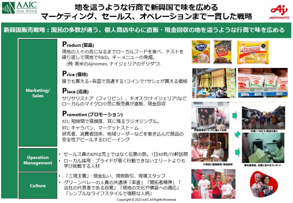 「地球行商人」の冒頭では、味の素社が1960年中盤、当時フィリピンに駐在員として赴任した古関啓一氏が中心となって、同社の新興国での 販売戦略の原型が構築される様子が描かれています。古関氏は、それまで行われていた卸売業者への掛売販売の支払いの滞りや情報の非対称性から生じる余剰在庫を問題とし、自社で販売部隊を組成し、現地の小規模個人商店のサリサリストアに直販・現金回収で販売する形式へ変更しました。 これに合わせて下記の通り営業管理、販売価格、プロモーションなども見直し、1970年前半には全国30販売支店を構え、販売量は10倍以上に拡大。現地での認知度も9割以上に達し、大きな成功を収めるモデルとなり、その後の同社の新興国での販売戦略の方向性を決めるものとなりました。 [フィリピンでの具体的な施策] ①業績管理:商品を現地に根付かせるために、販売員の業績指標を売上(金額)から伝票数(店舗)に変更し、1人1日40伝票(≒月1,000) ②誰でも手に取れるように、パッケージをサシェット(1袋3グラム)にして、現地で一般的に使われる少額のコイン(5センタボス)で買える価格に見直す ③高頻度で現地のラジオで30秒のCM、耳に残るジングル。 このフィリピンでの成功モデルを原型として、アジア、アフリカ、中東、南米と70年から2000年代にかけて段階的に立ち上がっていく新興国市場で同社のグリーンベレー部隊が現地で”Ajinomoto”ブランドを「地を這うような行商」で広げていきます。 各国の駐在員が現地の社員とともに、狂牛病、ハラル認証、新型コロナなどのグローバルな問題、模造品や競合品、現地法人従業員や現地サプライヤーの不正など様々なリスクに対応しながらも、現地の市場・生活に徹底的に入り込み新製品を投入し、新しい価値を各国の市場に浸透させていく様子が描かれています。60年代から現在に至るまで、古関氏から始まった販売戦略が脈々と駐在員、駐在員から現地法人の社員へと受け継がれる中で、「戦略」が「文化やイズム」までに深化していき、現在の”Ajinomoto”となった変遷が理解できます。