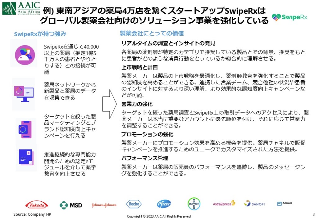 具体例として、東南アジアで急成長しているスタートアップSwipeRxについて、下図にまとめました。こちらはグローバル製薬会社が事業展開の際に直面する課題などに対してソリューション事業を提供しています。